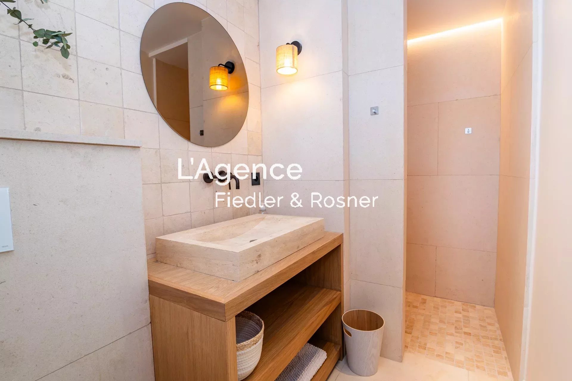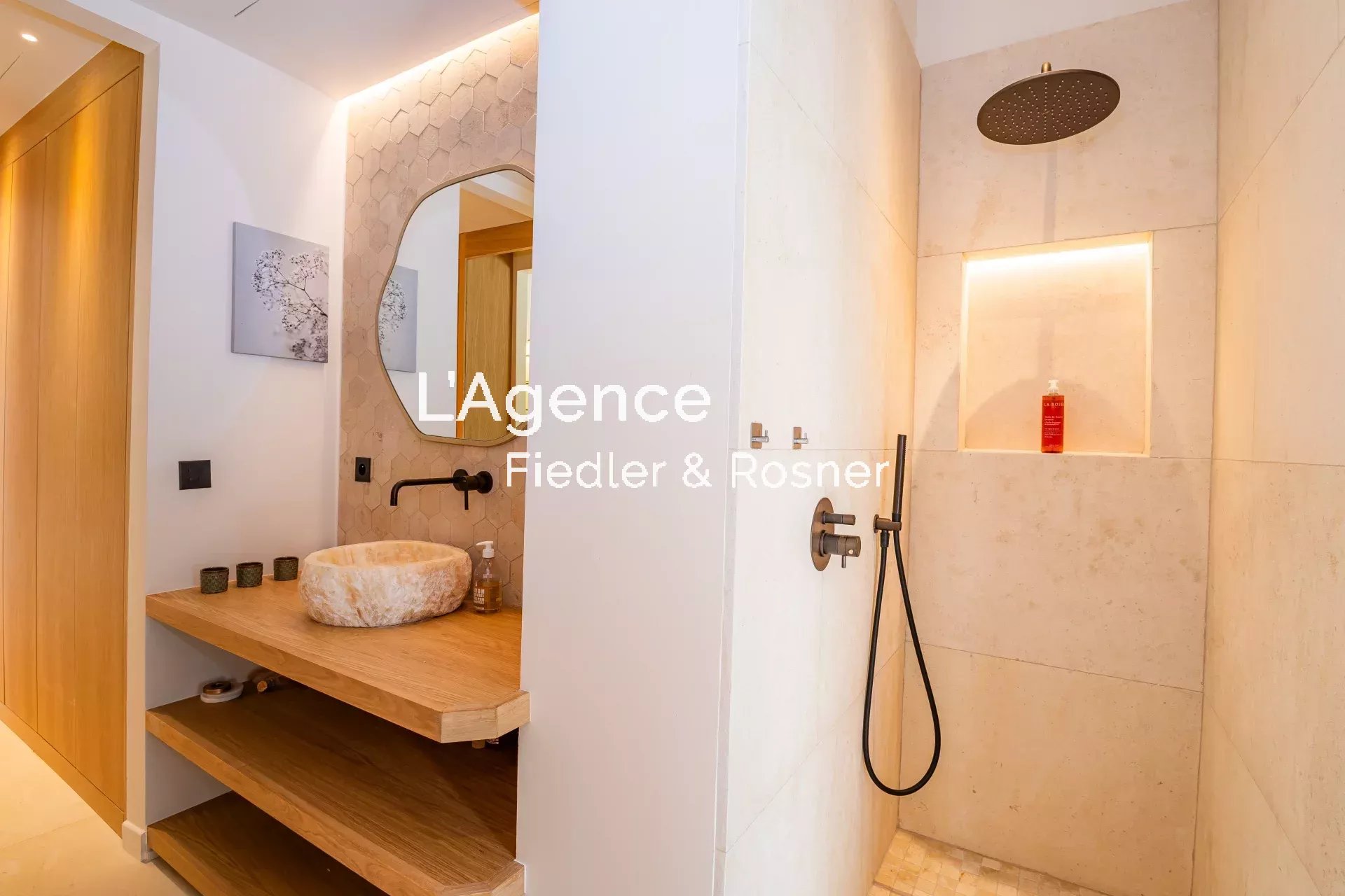 Upstairs, the master suite offers a generous space with a marble shower room and bath, as well as a beautiful private terrace.