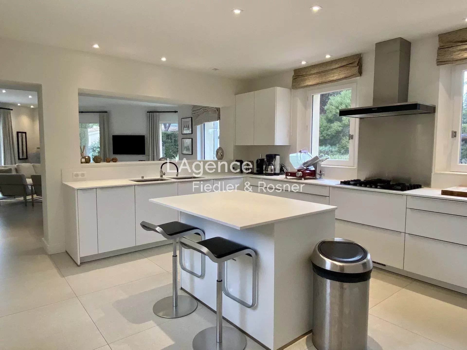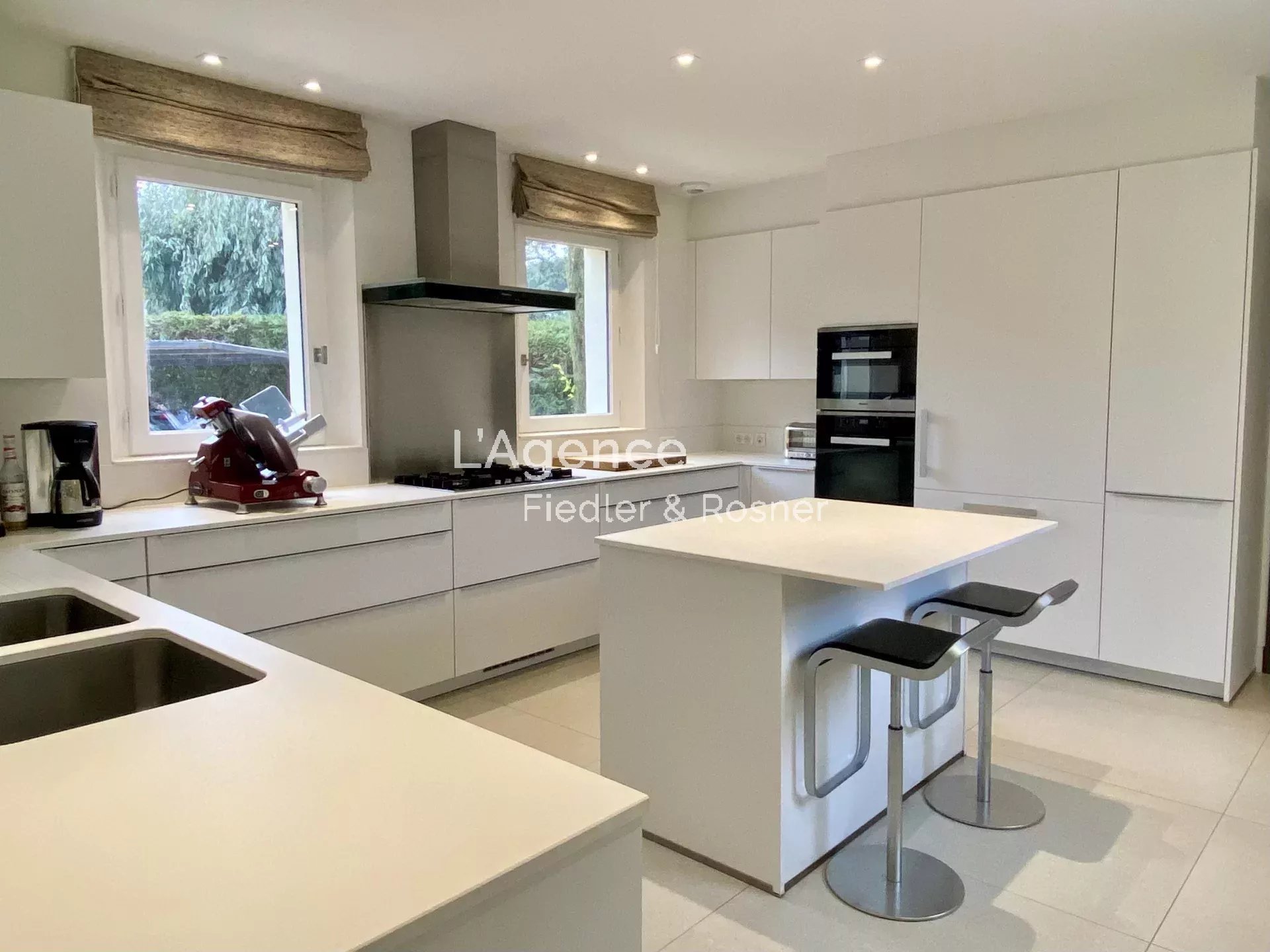A spacious kitchen fully equipped with American fridge, freezer, central island, dishwasher, oven, microwave oven, coffee machine.